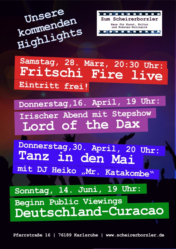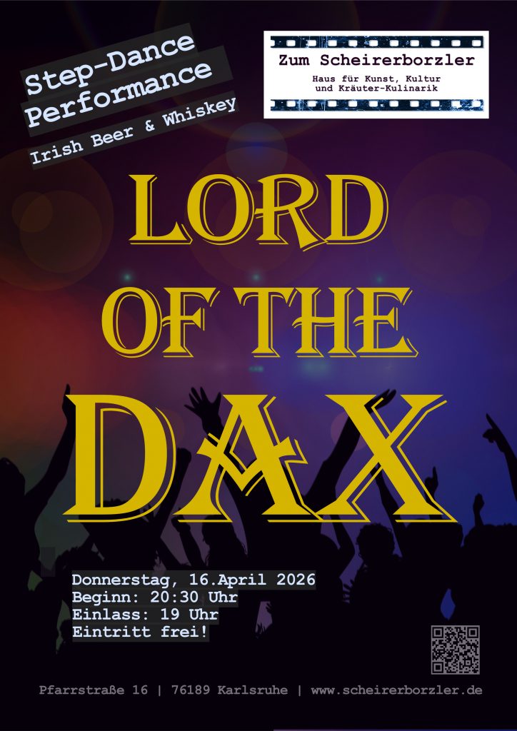 Erste kleine Stepdance-Show im Scheirerborzler. Eine Gruppe Daxlander Menschen hat sich unter der Choreografie von Steffi Großkopf zusammengefunden und eine Sequenz aus Lord of the Dance einstudiert. Wir präsentieren: Lord of the Dax! Umrahmt wird dieser kleine irische Abend mit Beer & Whiskey von der grünen Insel.